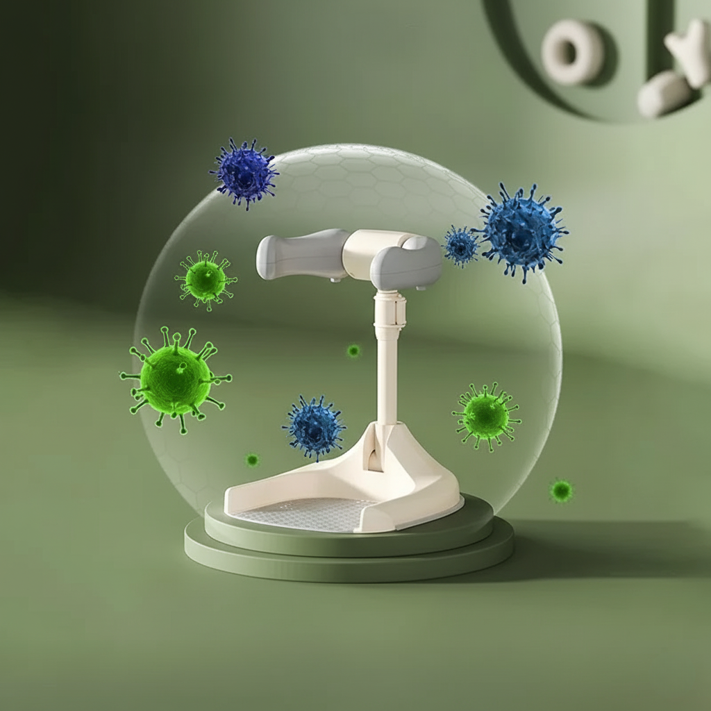 Asegurar: Coloca el soporte en el suelo del baño o dentro de la bañera. El agarre reforzado asegura la base para que no se mueva.