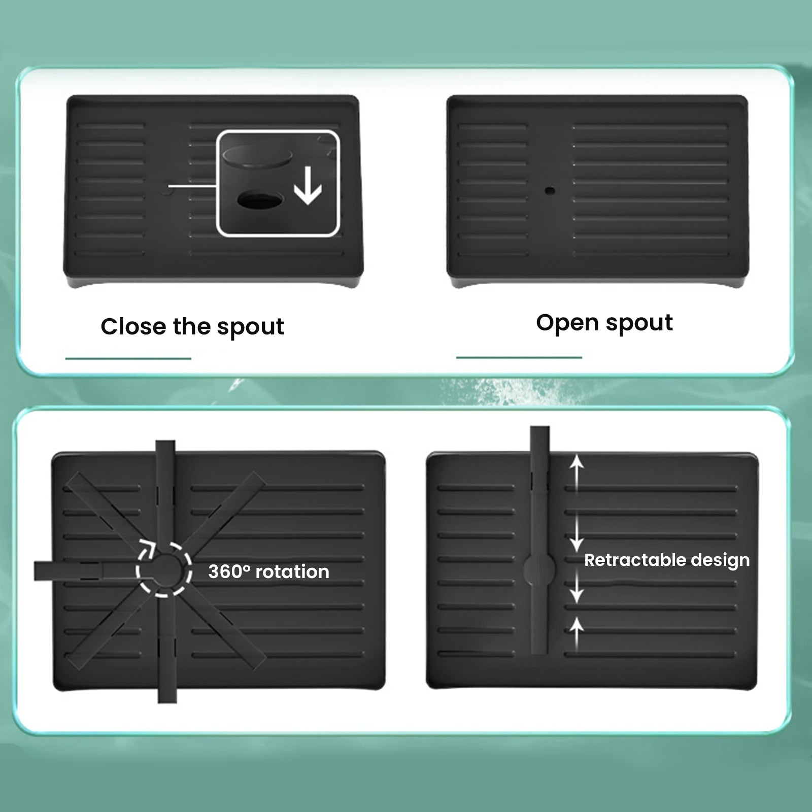 Autodrenaje 360° Garantizado: Incorpora un orificio de desagüe central conectado a una boquilla giratoria de 360°. Esto significa que puedes colocar el escurridor en cualquier ángulo junto al fregadero, y el agua será dirigida directamente al lavabo, sin que caiga ni una sola gota sobre tu encimera.